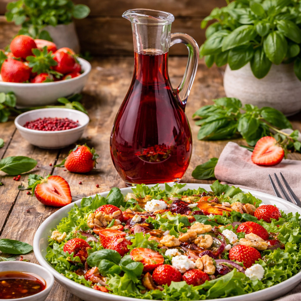 Der Erdbeer Balsam Essig eignet sich hervorragend für die Zubereitung von fruchtigen Salatdressings. In Kombination mit hochwertigem Olivenöl entsteht im Handumdrehen ein aromatisches Dressing, das besonders gut zu Blattsalaten, Rucola oder Feldsalat mit Nüssen und Croutons passt.
