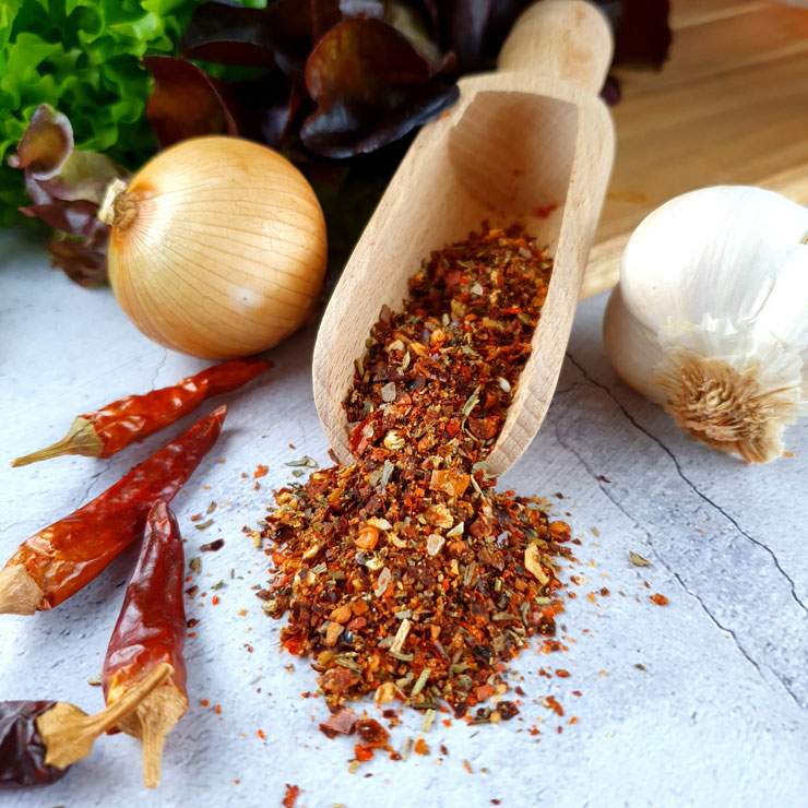 Zutaten: Chili, Paprika, Zwiebeln, Knoblauch, Thymian, Rosmarin, Oregano, Basilikum, Steinsalz, Rohrzucker